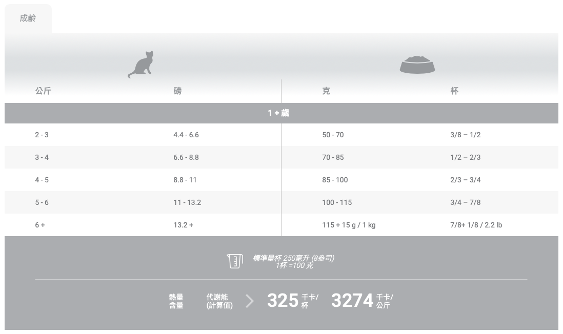 蛋白質 28%、脂肪含量 12%、粗纖維 4.5%、無機物 9%、鈣 1%、磷 0.8%、鎂 0.1%、牛磺酸 1,700 mg/kg 、甘露寡糖 1,000 mg/kg 、低聚果糖 500 mg/kg。