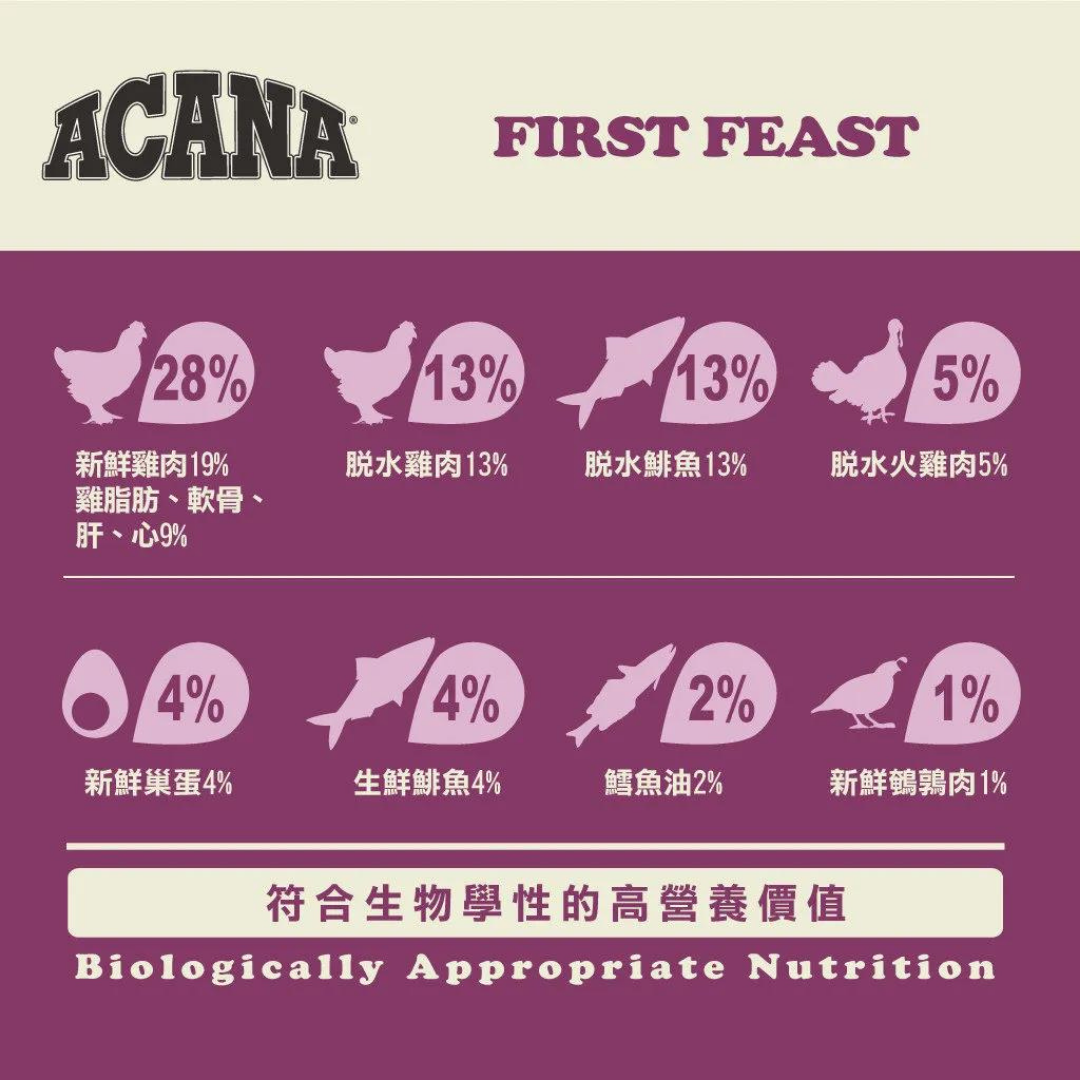 ACANA FIRST FEAST 愛肯拿第一盛宴貓飼料,適合幼貓和母貓。70%優質肉含量,豐富的動物性營養及蛋白質,提供骨骼與肌肉成長所需營養。