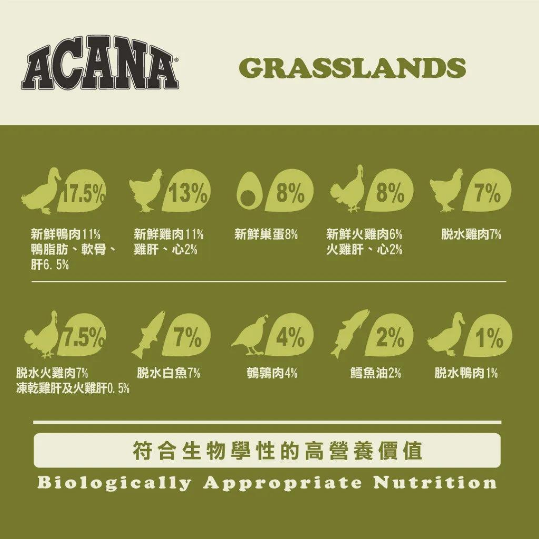 ACANA GRASSLANDS 愛肯拿草原盛宴貓飼料,75%優質肉含量,使用新鮮放養鴨肉、雞肉、火雞肉、鵪鶉肉及野生漁獲,給您的愛貓一場草原盛宴。
