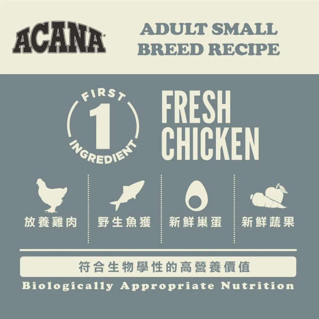ACANA Adult Small Breed 小型成犬飼料,使用新鮮雞肉、野生魚獲和巢蛋,60%優質肉含量,40%蔬果和草本植物,滿足您愛犬營養需求。