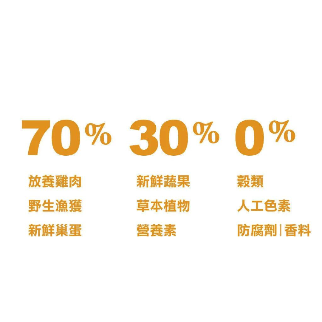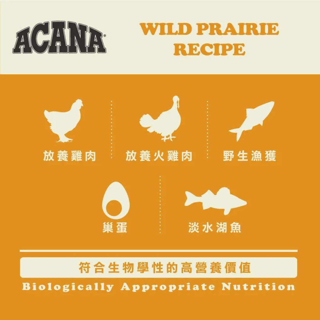 ACANA Wild Prairie 愛肯拿農場饗宴狗飼料,70%優質肉含量,使用新鮮或生鮮的放養雞肉與火雞肉、淡水湖魚及巢蛋,加上新鮮蔬果與草本植物。