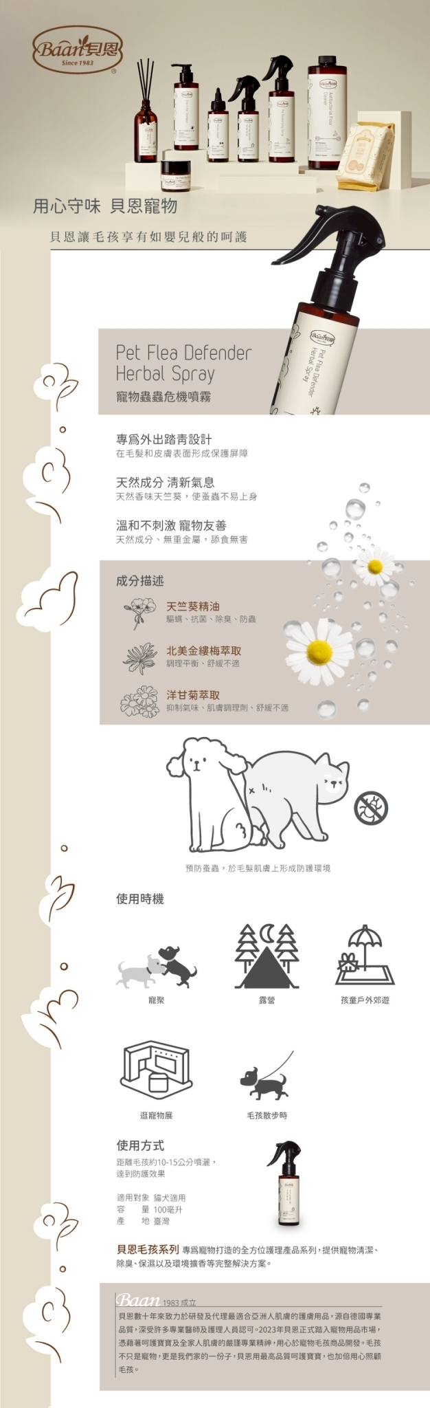 ★ 貝恩寵物蟲蟲危機噴霧,專為外出踏青設計,在毛髮及皮膚表面形成保護屏障。自然天竺葵氣味,使蚤蟲不易上身。