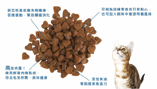 含有天然膳食纖維及植物油,添加貓咪所需牛磺酸支持勢力及心臟健康。