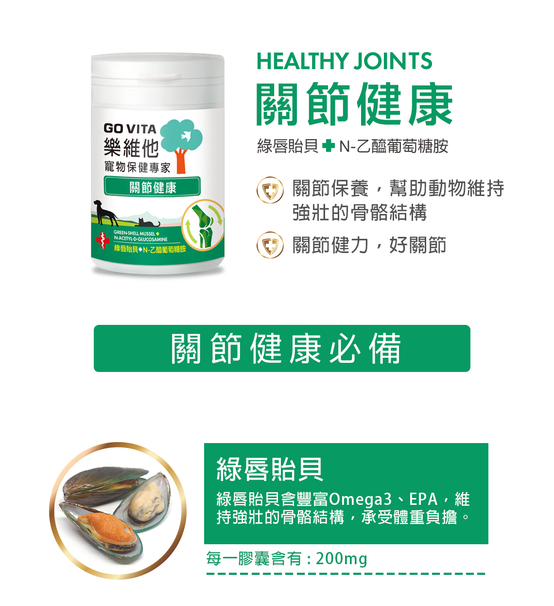 活性成分/膠囊 : 綠唇貽貝   200 mg、N-乙醯葡萄糖胺   150 mg