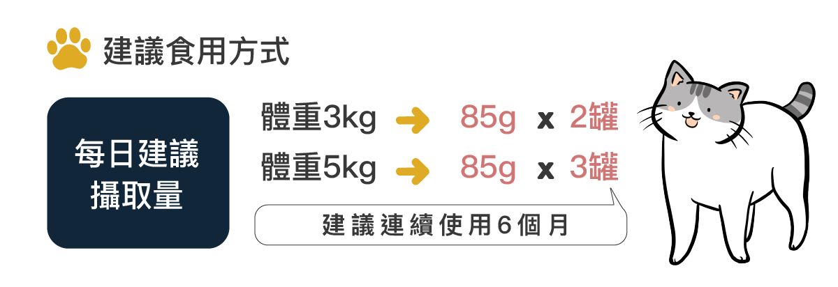 ▸ 建議攝取量:每日建議攝取量:體重3kg:85g*2罐/體重5kg:85g*3罐。
