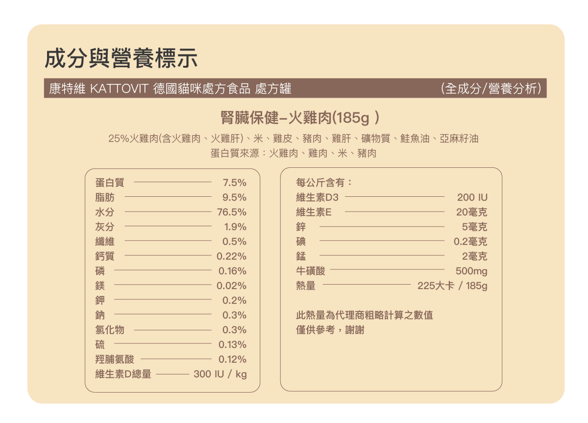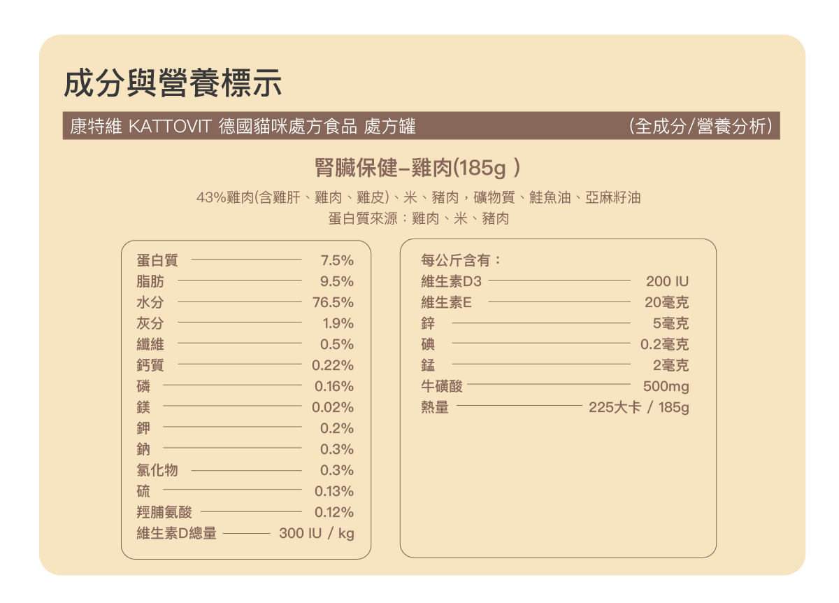 ▸ 每公斤含有:維生素A:1040 IU、維生素D3:125 IU、維生素E:20毫克、鐵:40毫克、鋅:27.5毫克、銅:1.2毫克、錳:1.0毫克、碘:0.6毫克、牛磺酸:420毫克