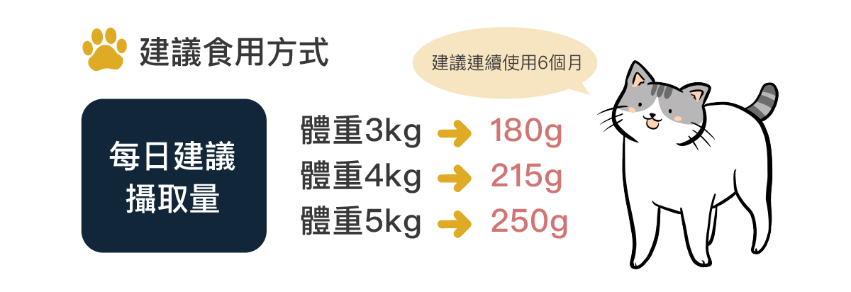▸ 建議攝取量:體重3kg:180克/體重4kg:215克/體重5kg:250克