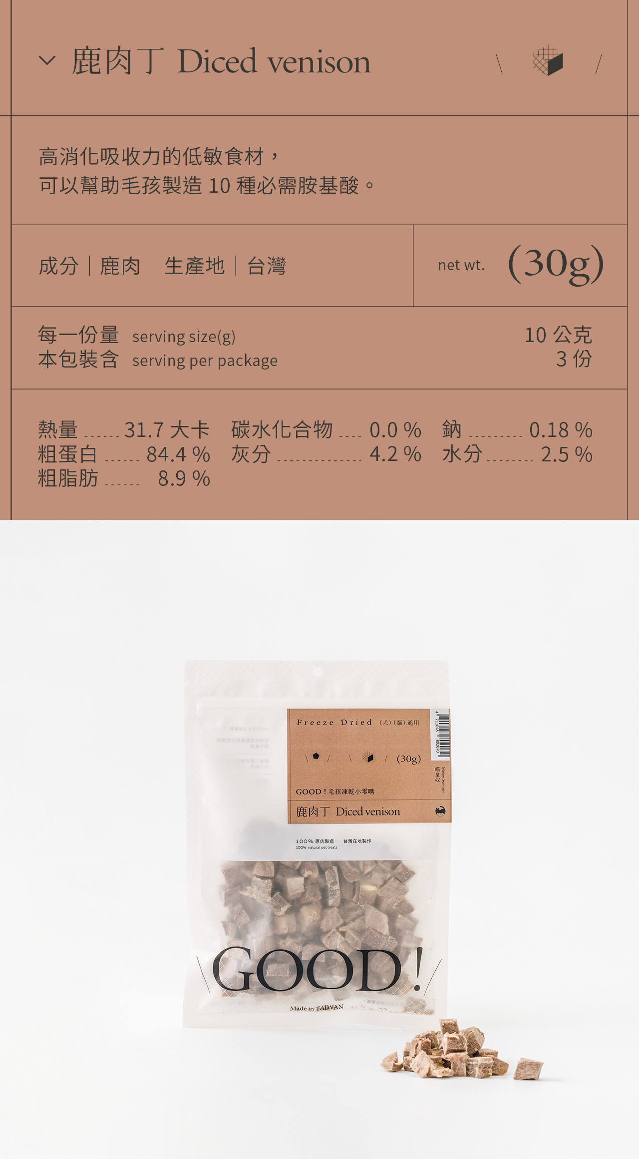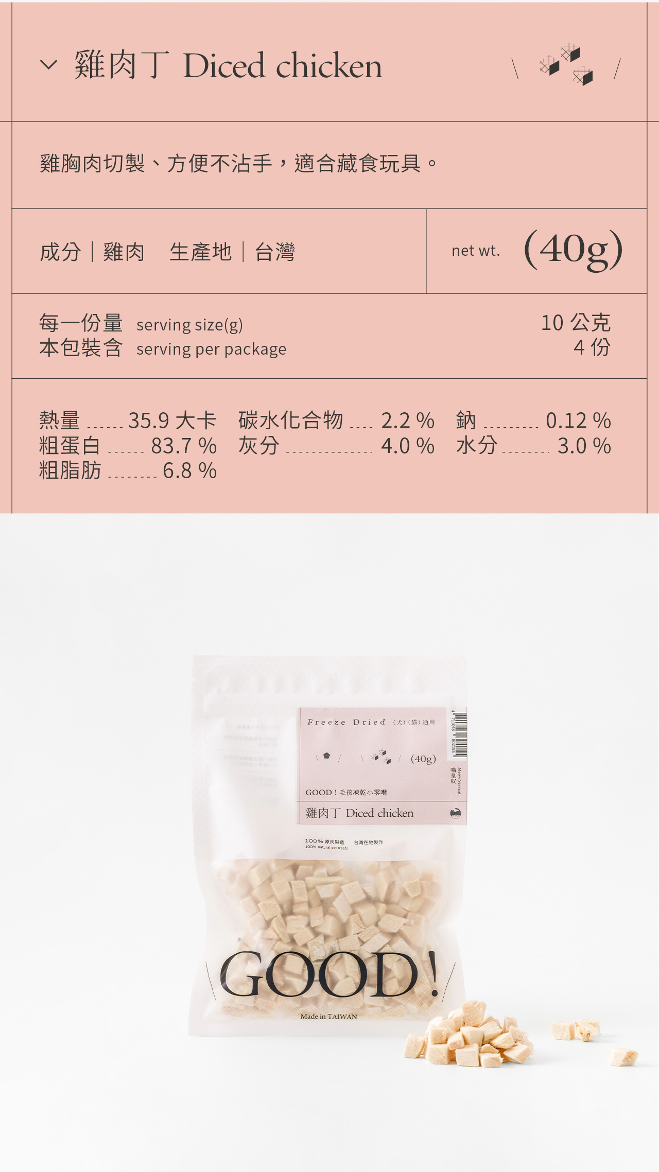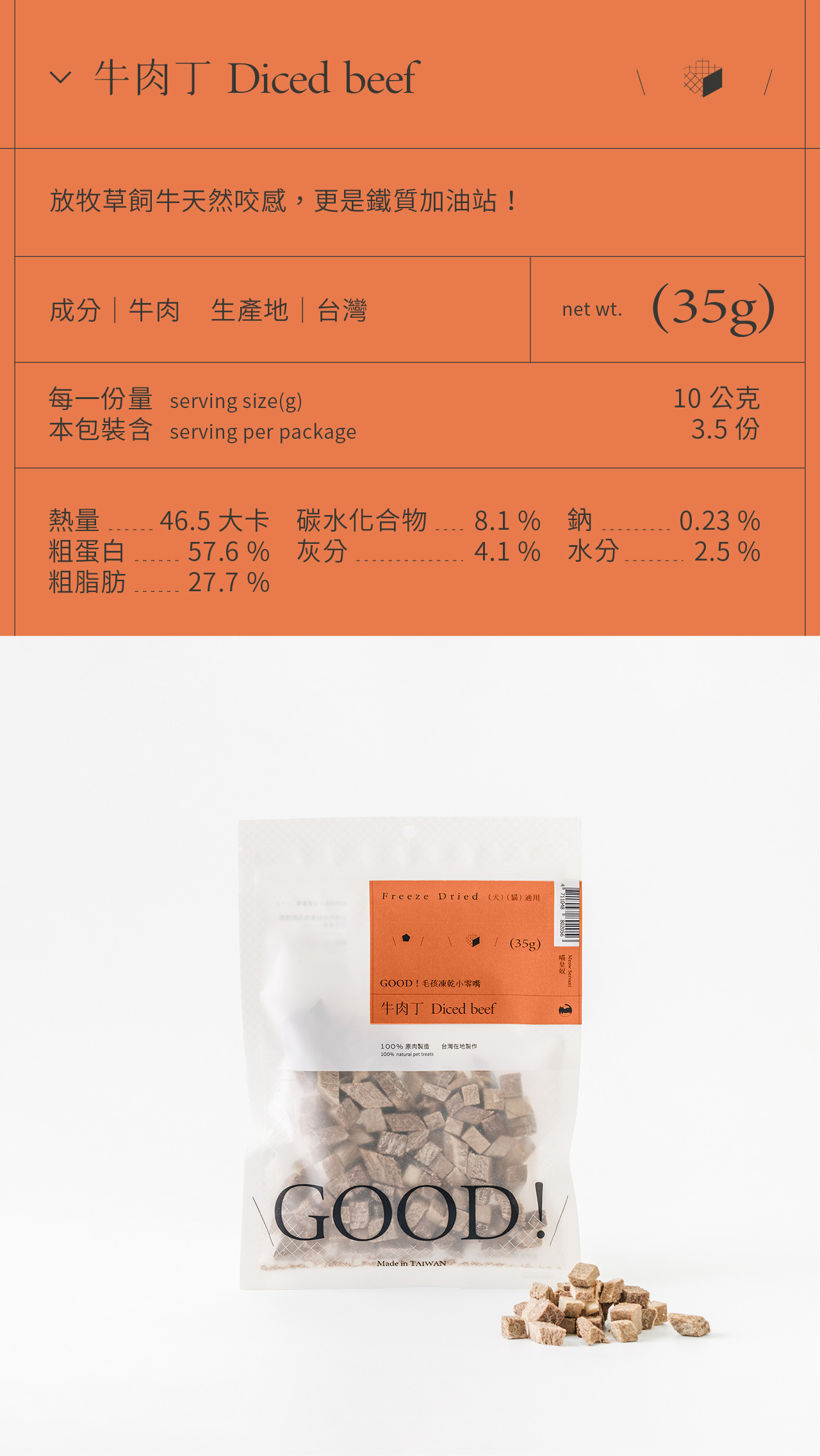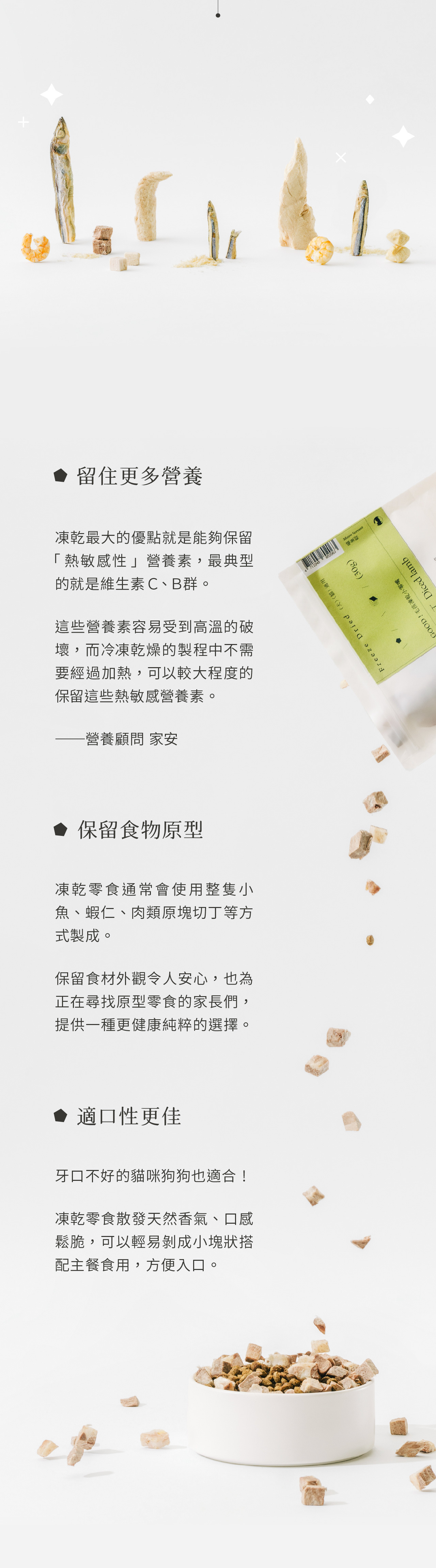 整塊原肉切製,利用「冷凍乾燥技術 Freeze dried」製成、保留更多熱敏性營養,無添加防腐劑及食品添加劑,是貓咪狗狗都可以吃的純粹零食。