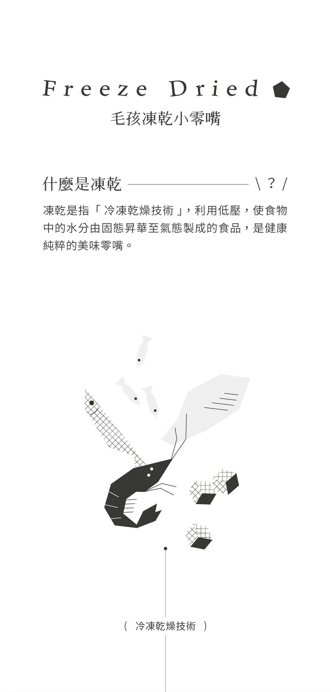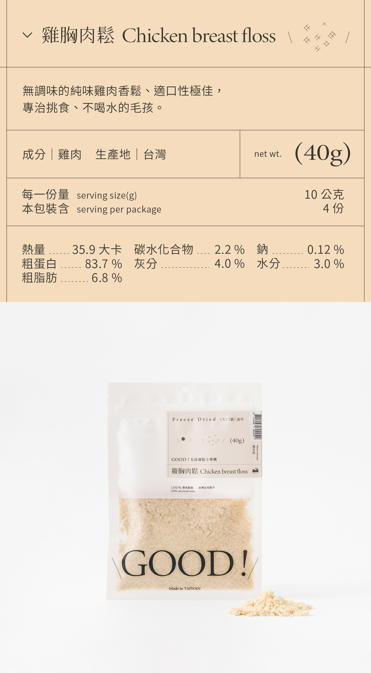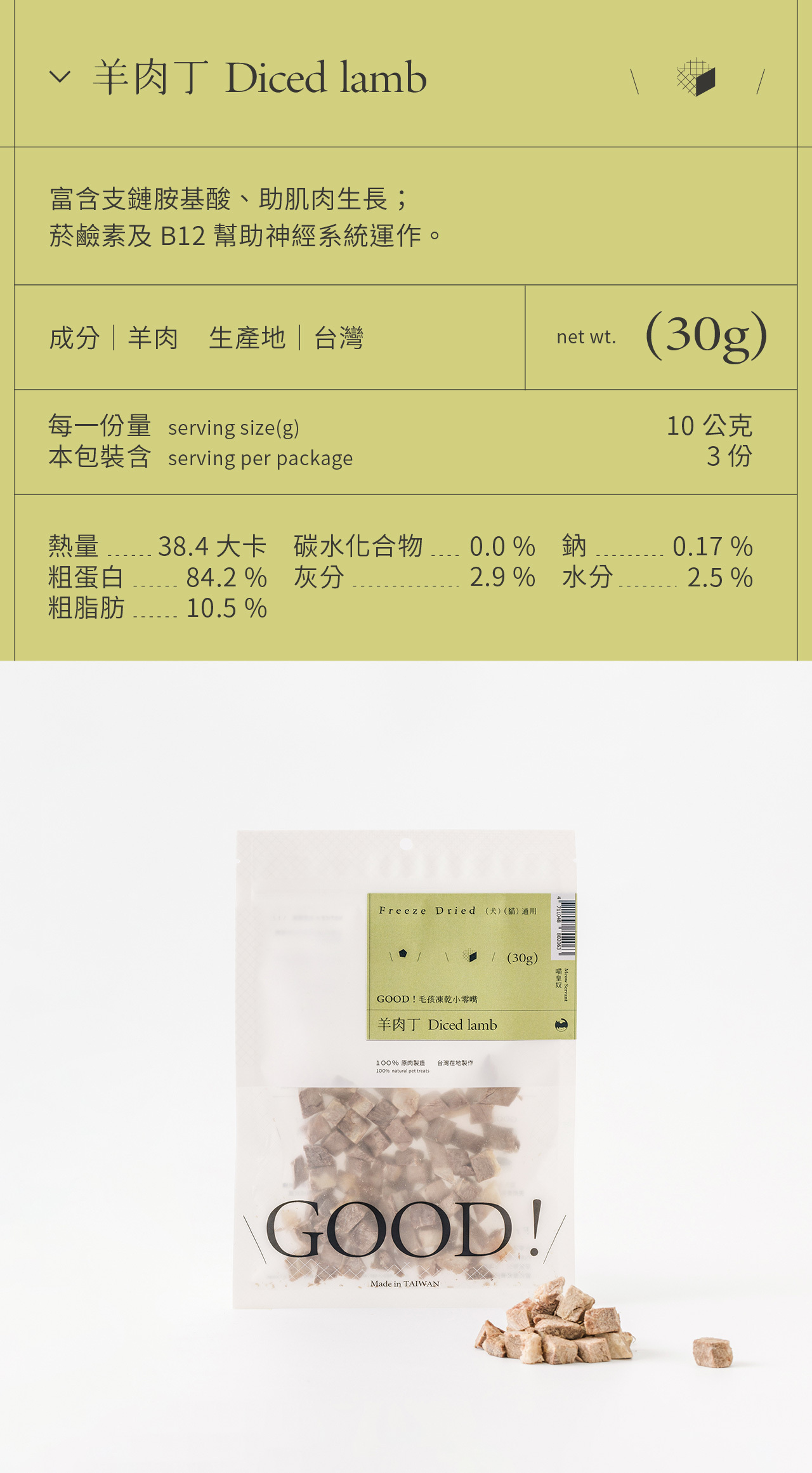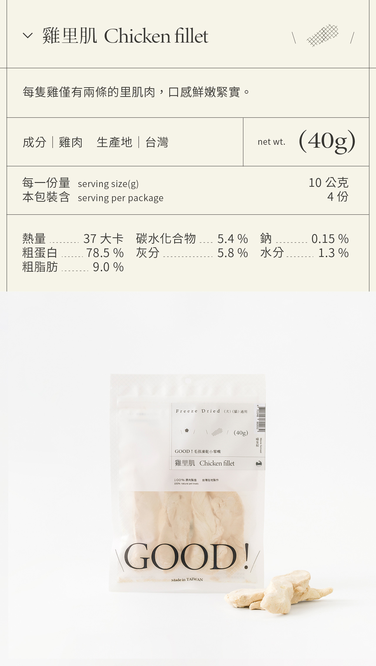整塊原肉切製,利用「冷凍乾燥技術 Freeze dried」製成、保留更多熱敏性營養,無添加防腐劑及食品添加劑,是貓咪狗狗都可以吃的純粹零食。