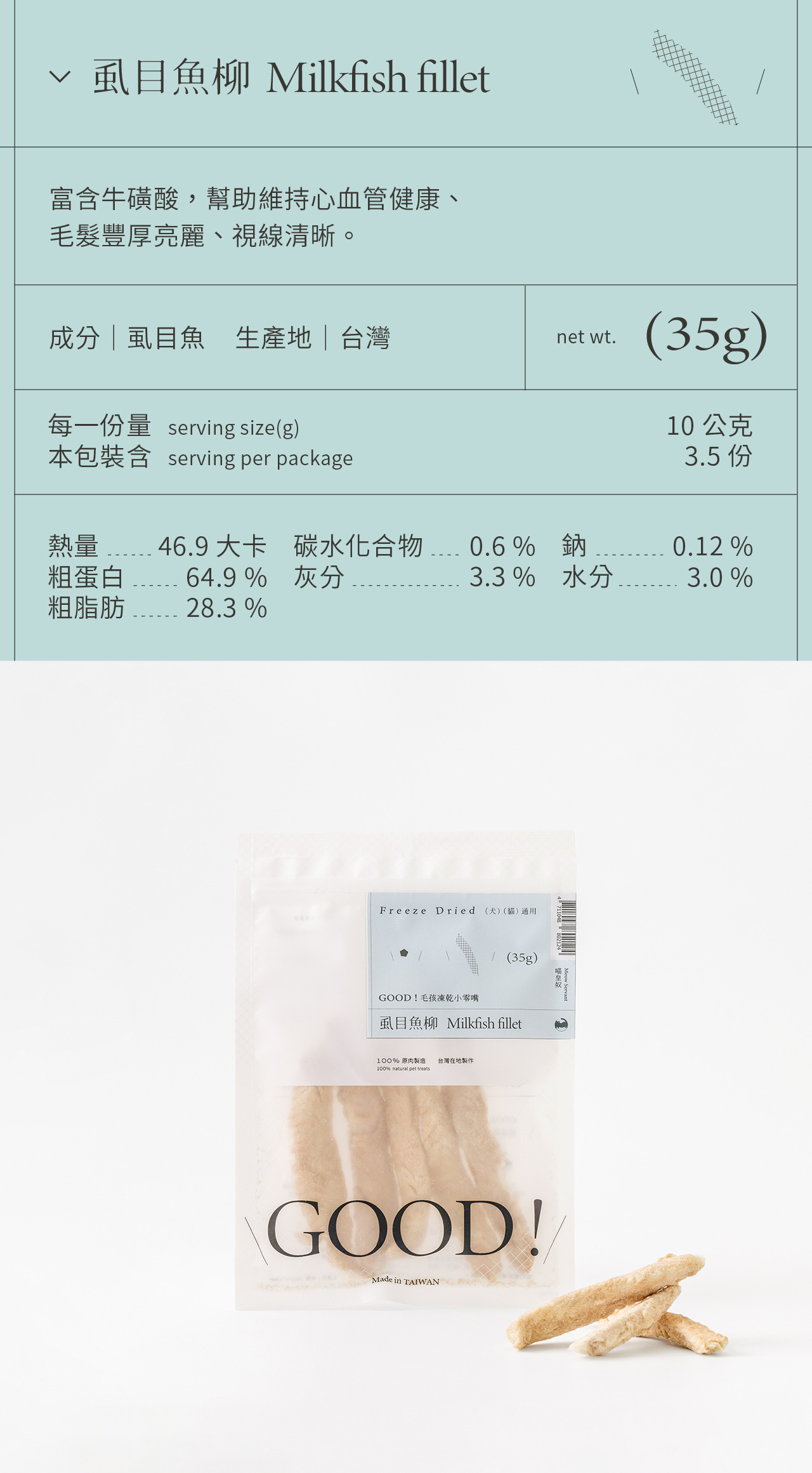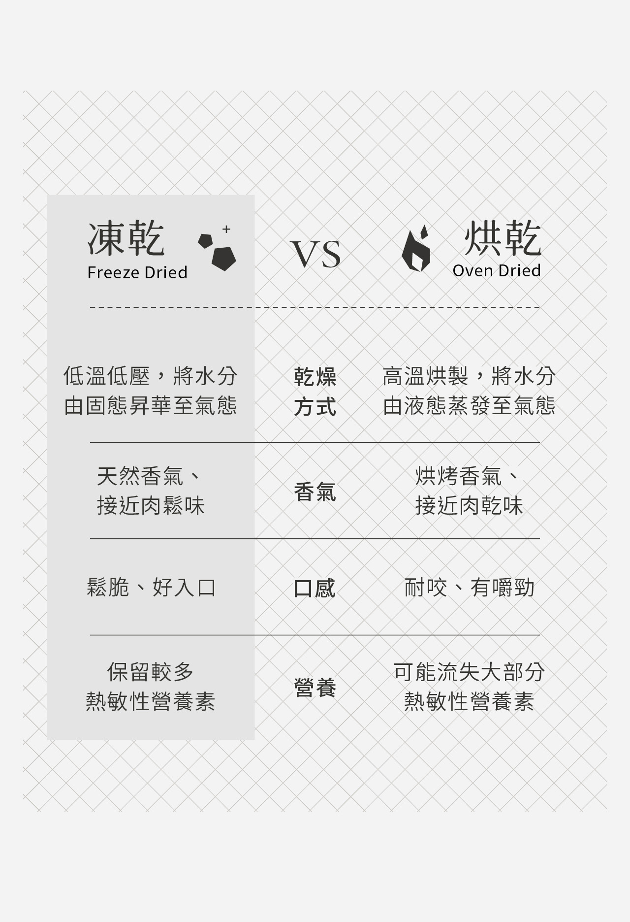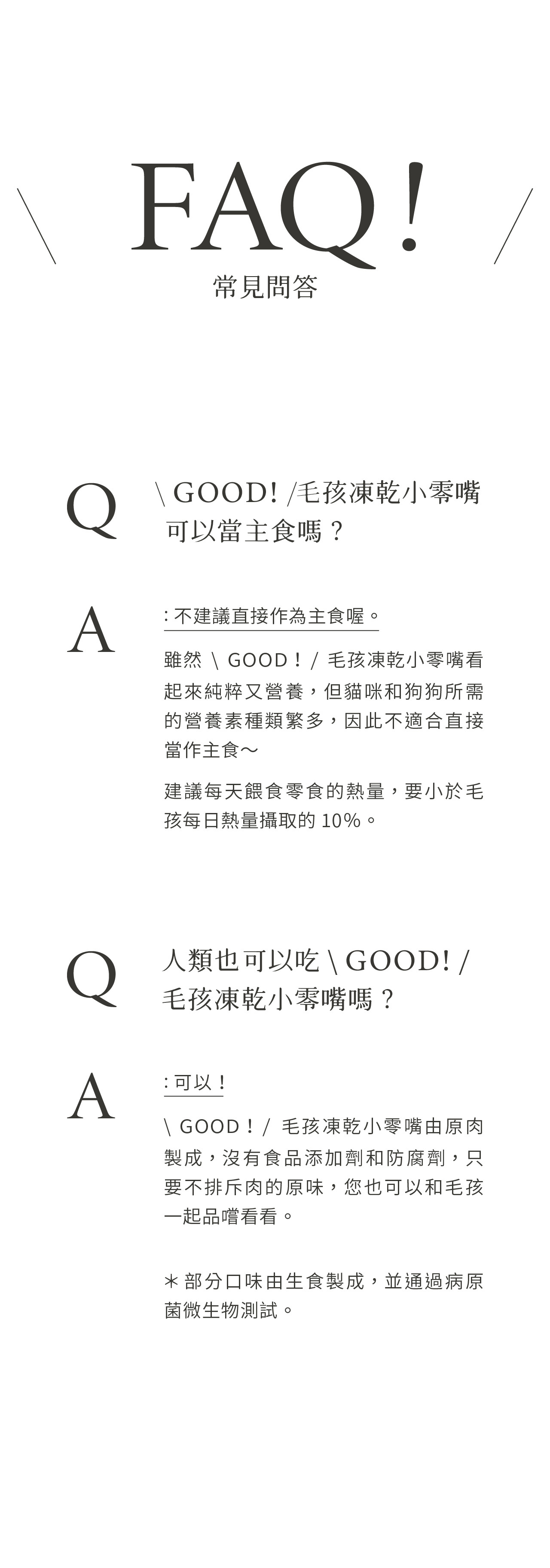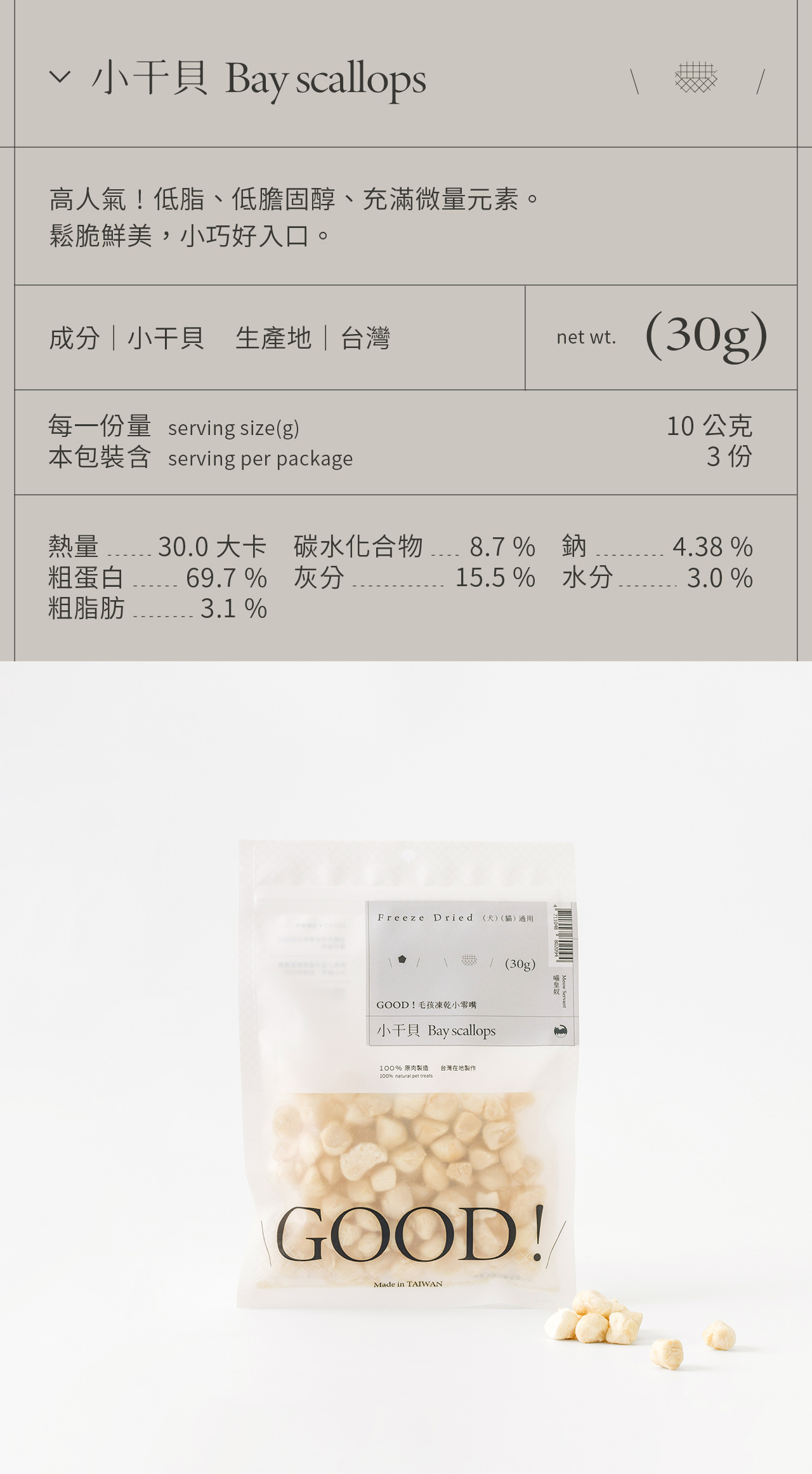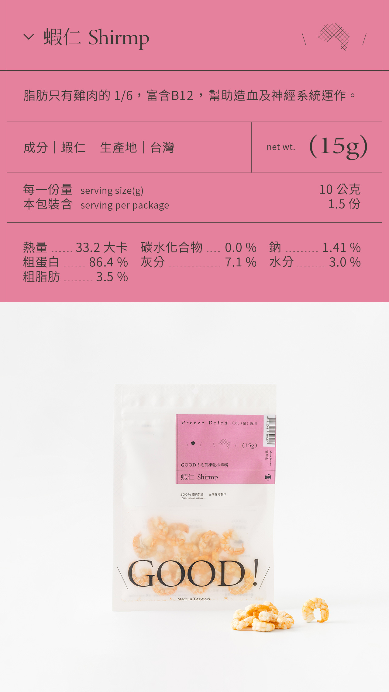 整塊原肉切製,利用「冷凍乾燥技術 Freeze dried」製成、保留更多熱敏性營養,無添加防腐劑及食品添加劑,是貓咪狗狗都可以吃的純粹零食。