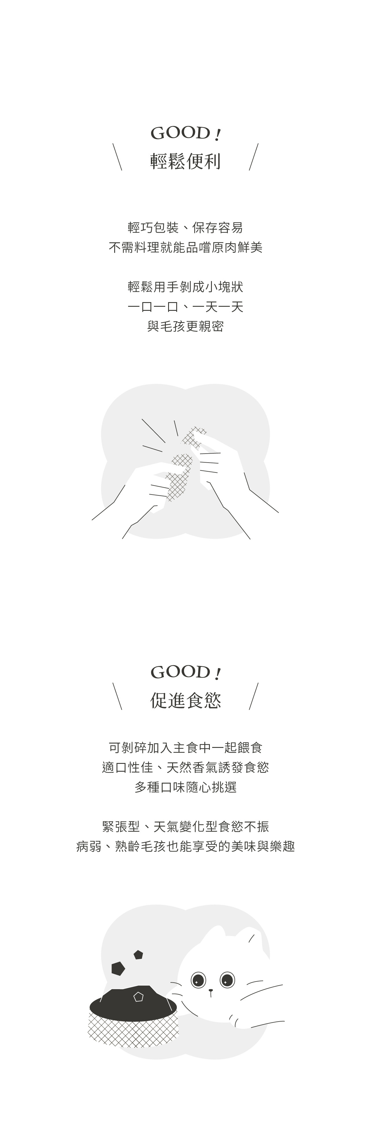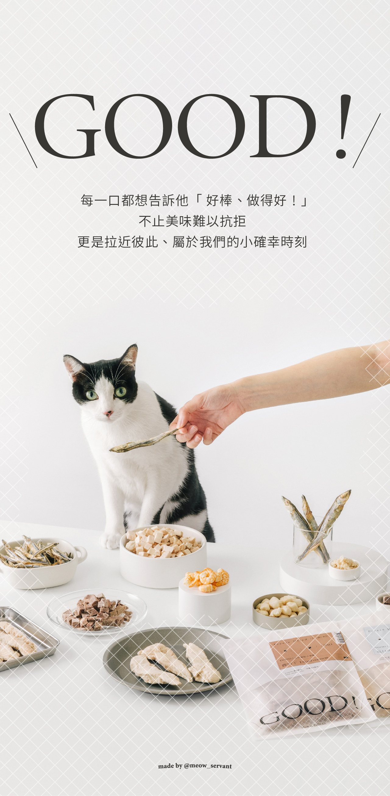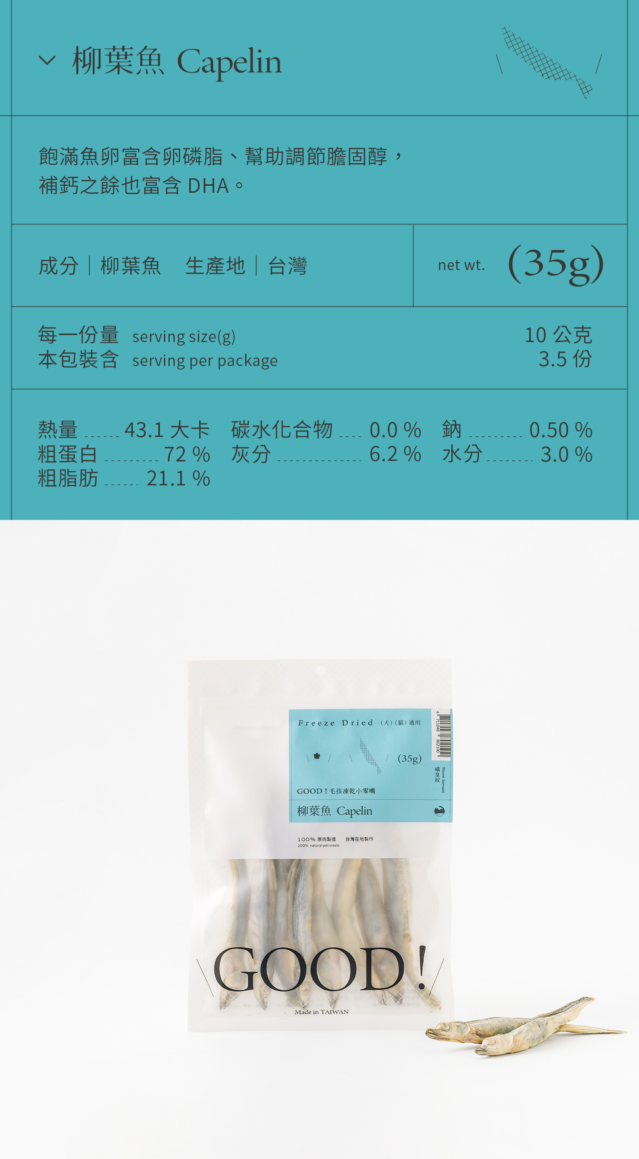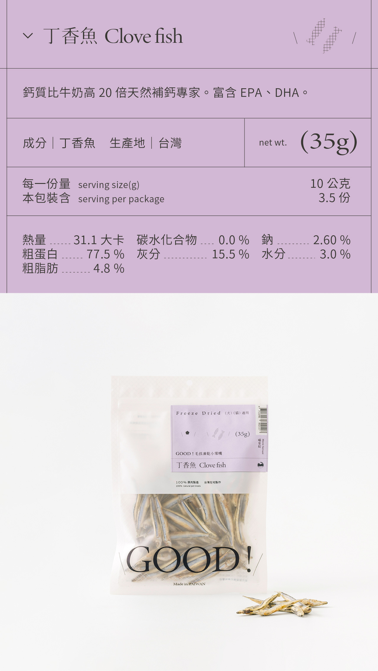 整塊原肉切製,利用「冷凍乾燥技術 Freeze dried」製成、保留更多熱敏性營養,無添加防腐劑及食品添加劑,是貓咪狗狗都可以吃的純粹零食。