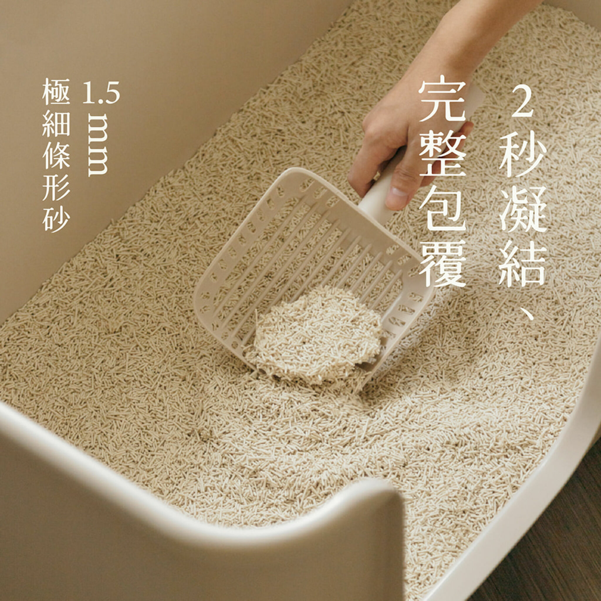 1.5mm/2.00mm 極細條砂,全面包覆異味。採用全天然豌豆纖維,添加黃金蜆貝殼鈣,除臭效果再升級。2秒瞬時結團、不揚塵、不崩砂,環境清新好整理。