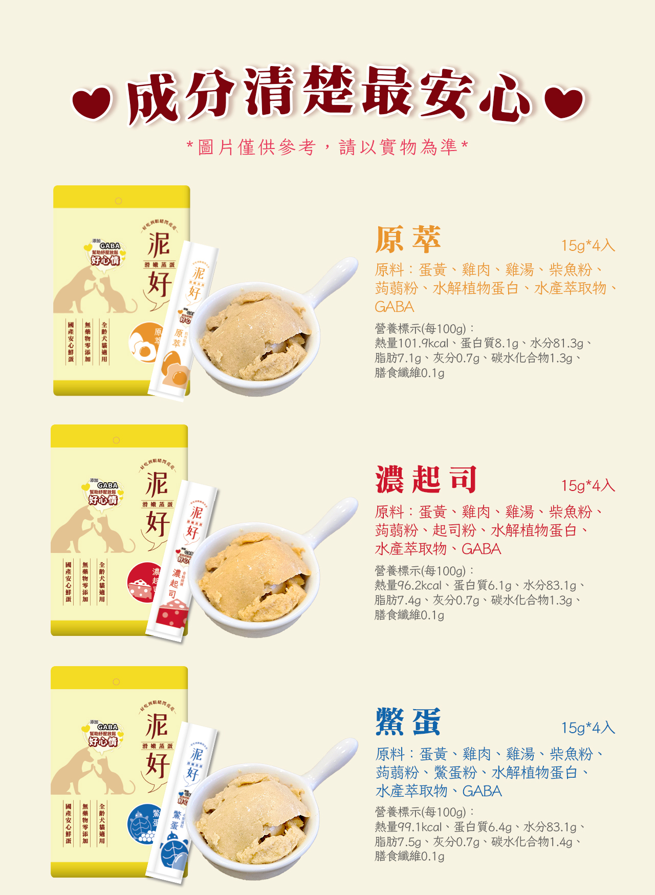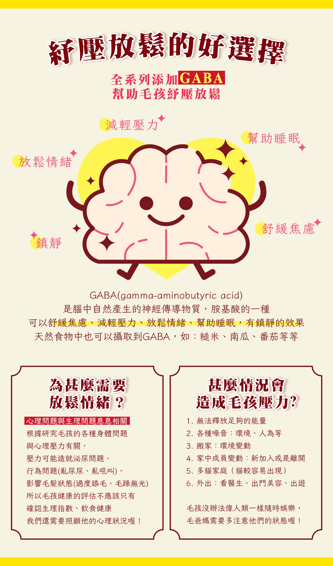 添加GABA幫助犬貓放鬆紓壓。成分單純,無添加任何香精、人工調味料。全齡犬貓皆適合。