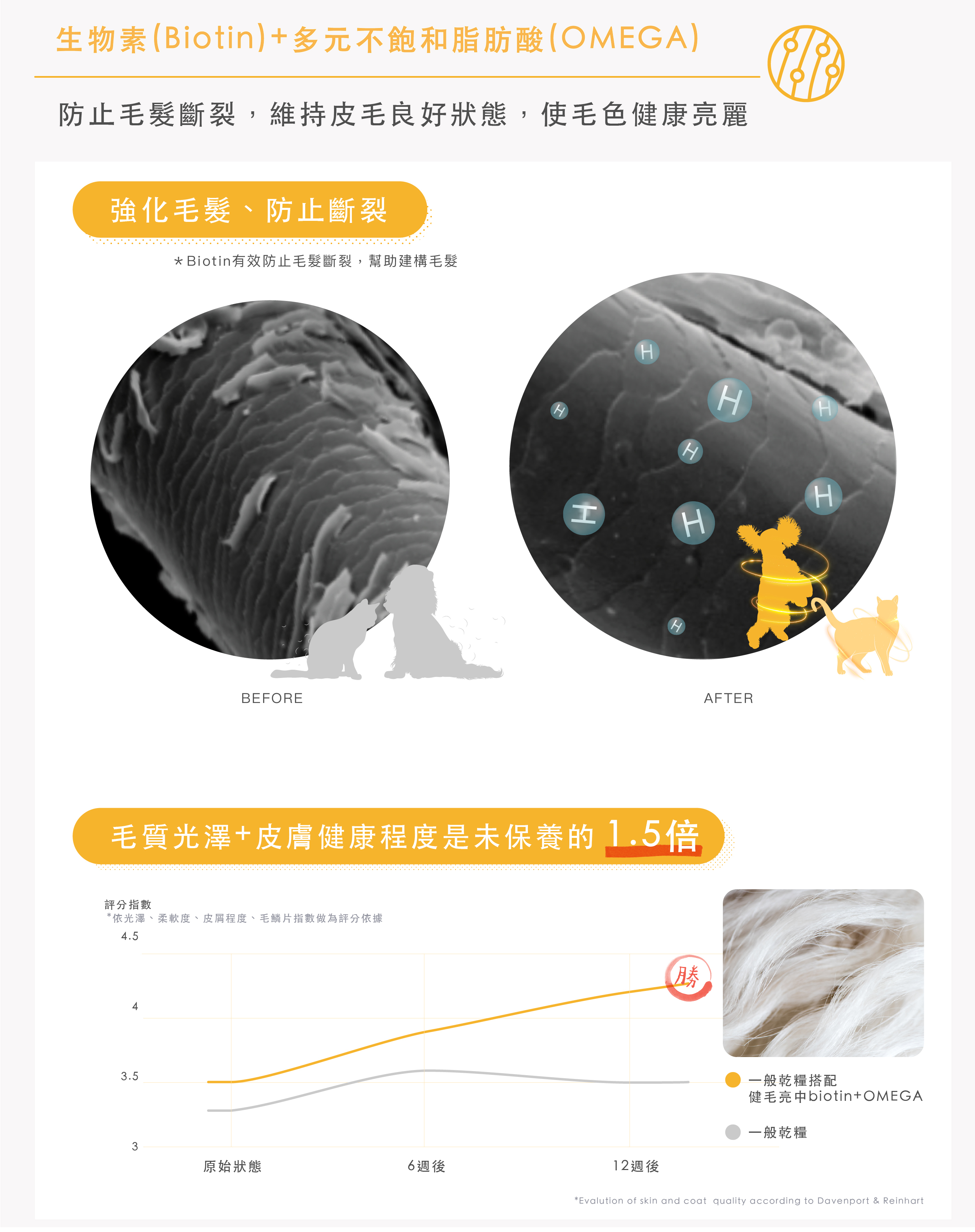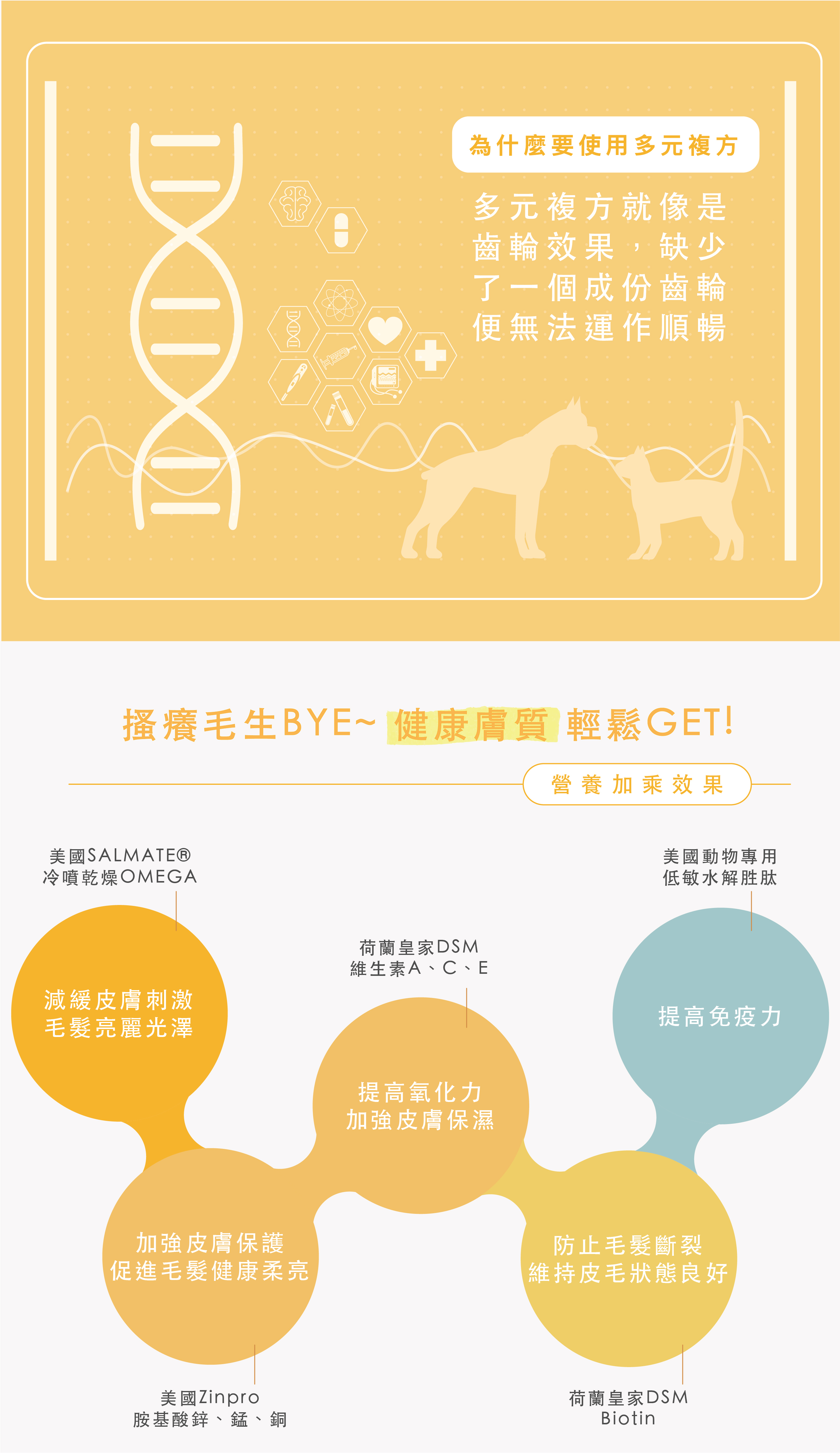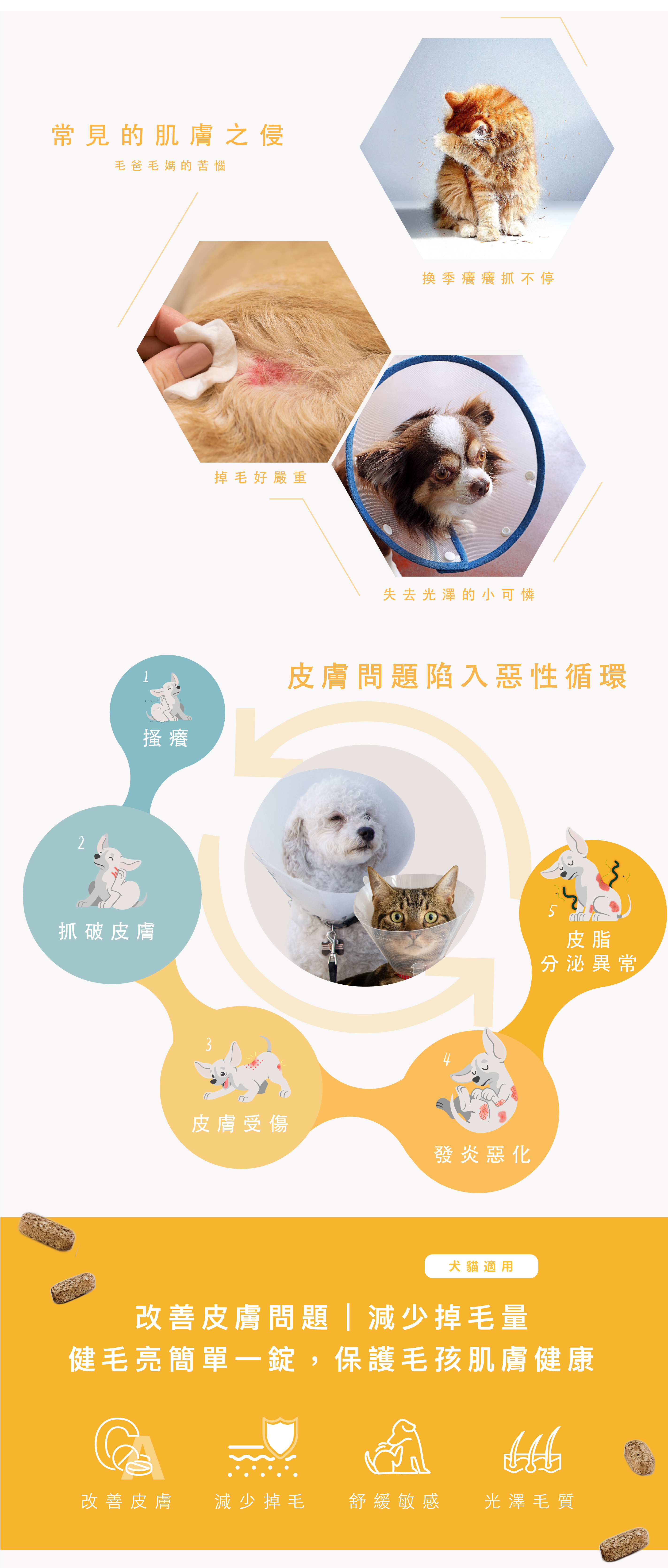 促進毛孩皮膚毛髮健康柔亮,加強毛髮彈性,防止毛髮斷裂