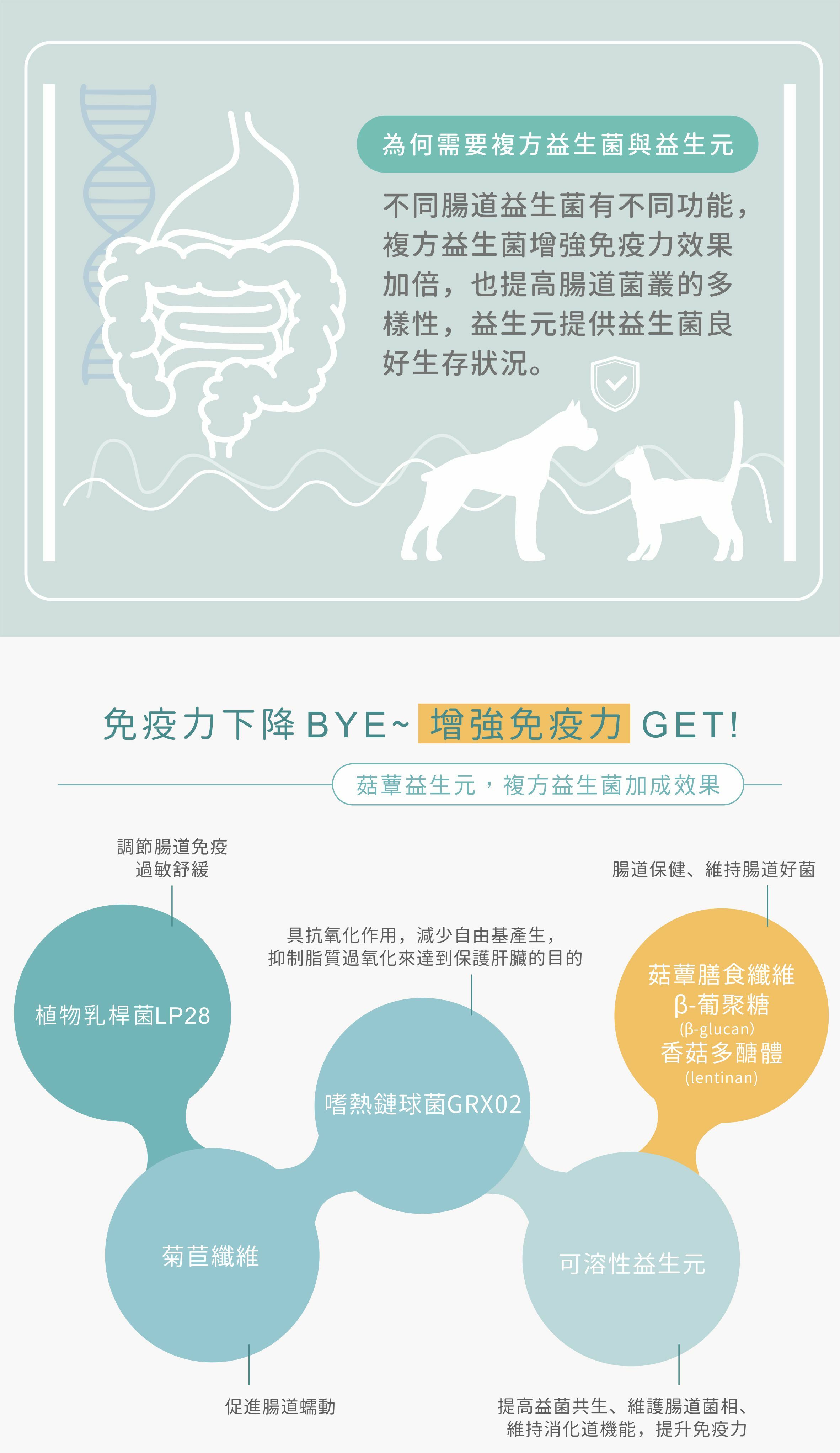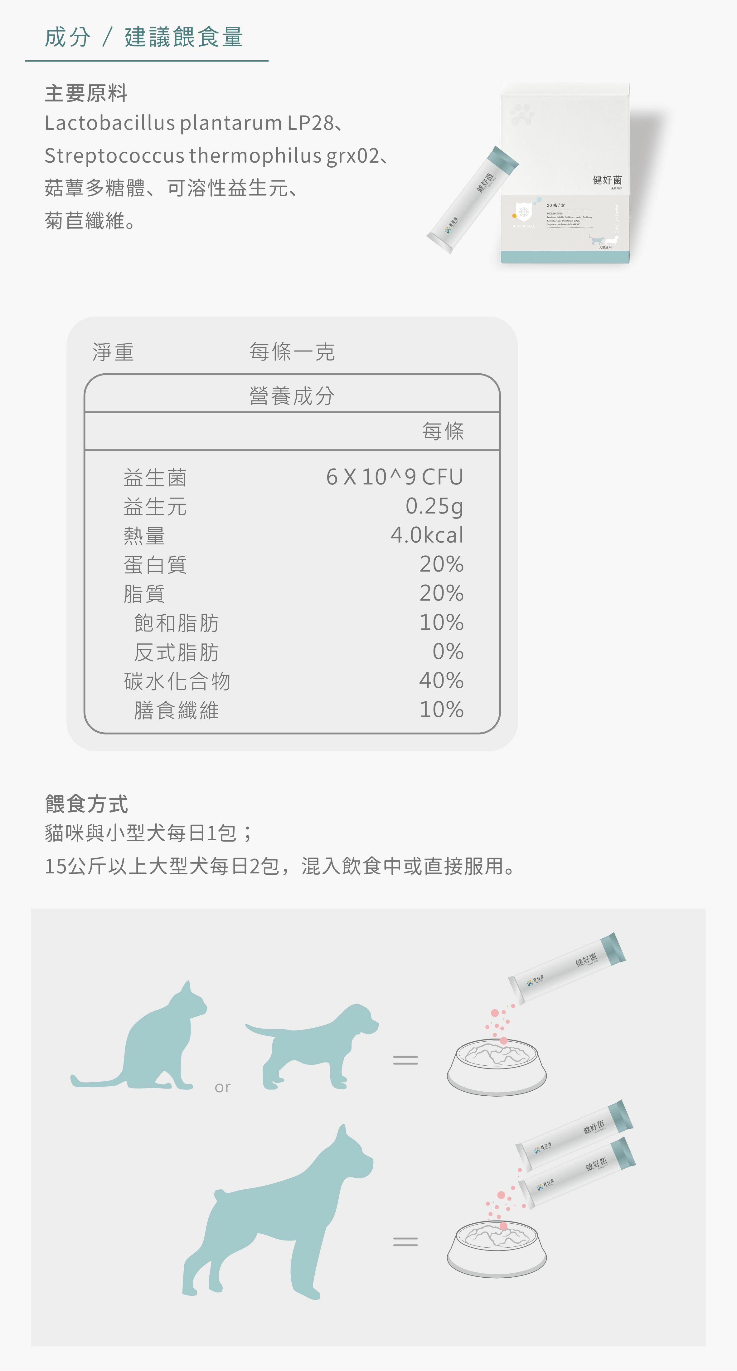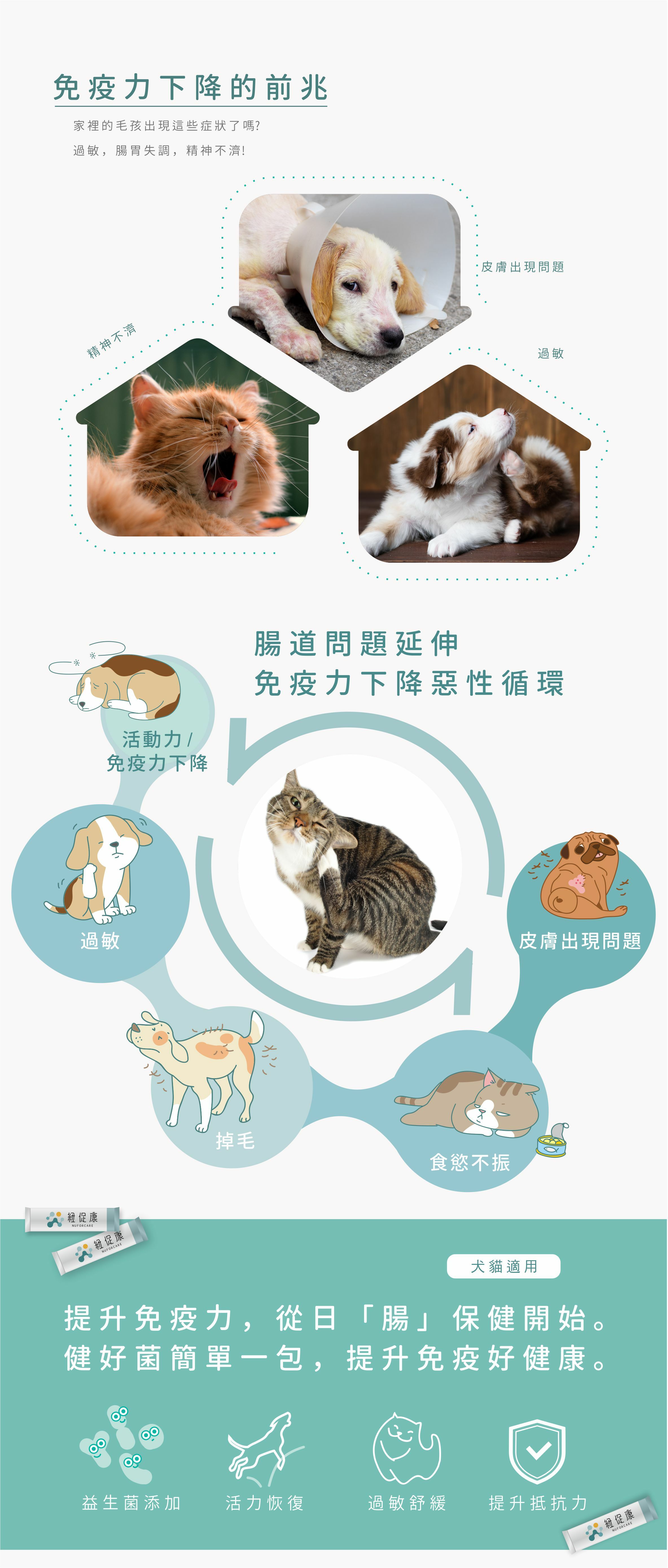 適合寵物腸道的乳桿菌,刺激免疫力,達到腸道自我保護效果,維持寵物健康,幫助貓還活力滿分。