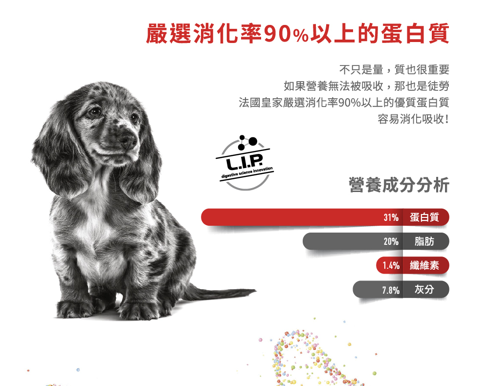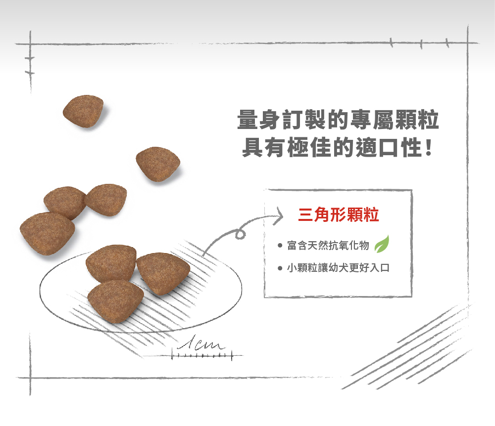 ◆ 添加具科學實證之營養複合物,包含維生素E和維生素C,支持幼犬免疫系統的發展