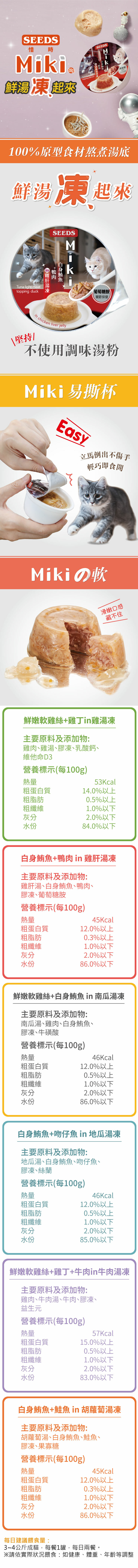 Miki滑嫩口感藏不住,採易撕杯封裝設計,立馬倒出不傷手,輕巧即食開,特別添加機能配方,值得愛貓細細品嚐。