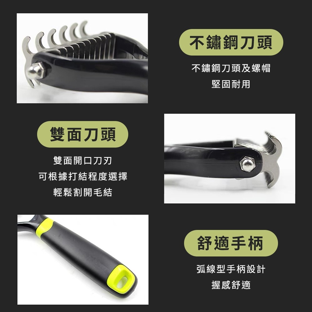 ● 雙面開口刀刃,可根據打結程度選擇,輕鬆割開毛結