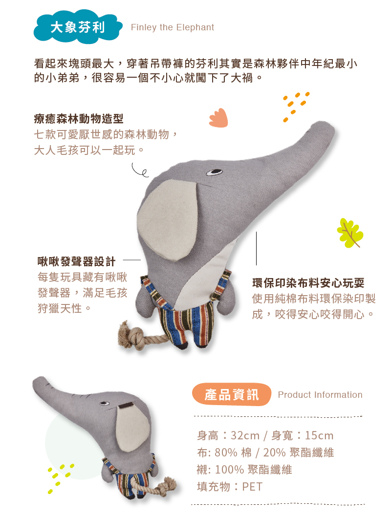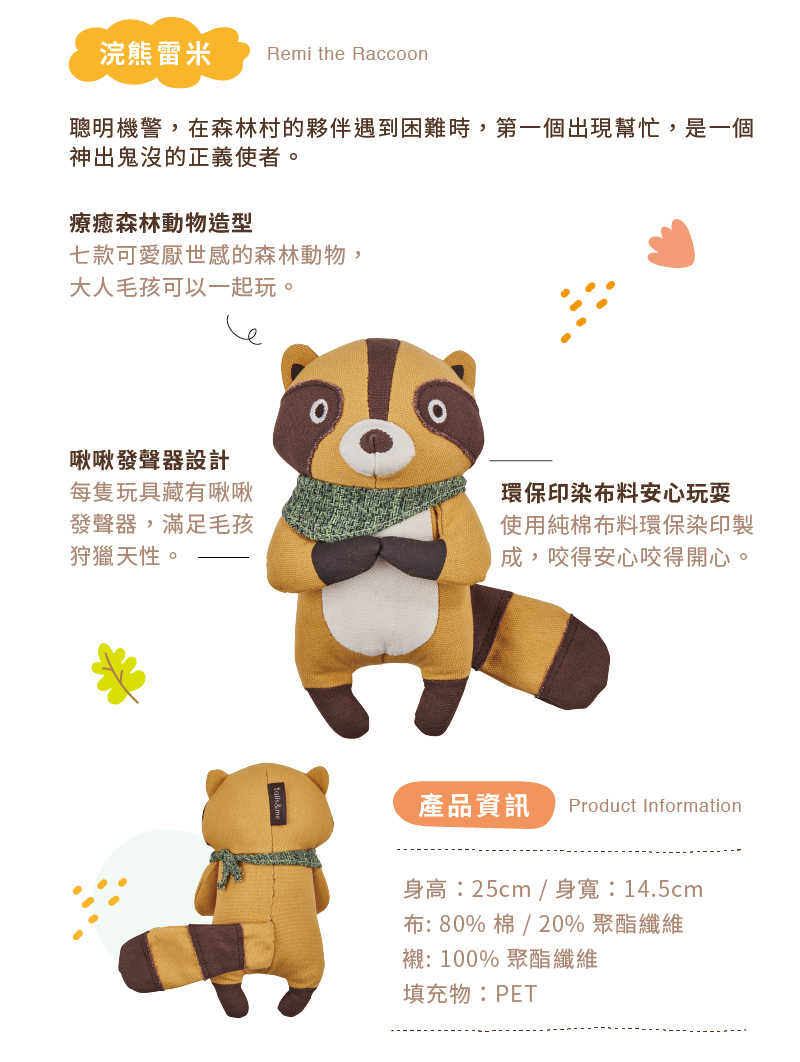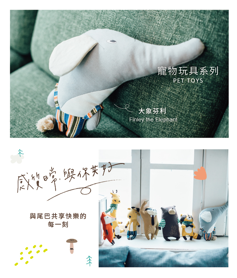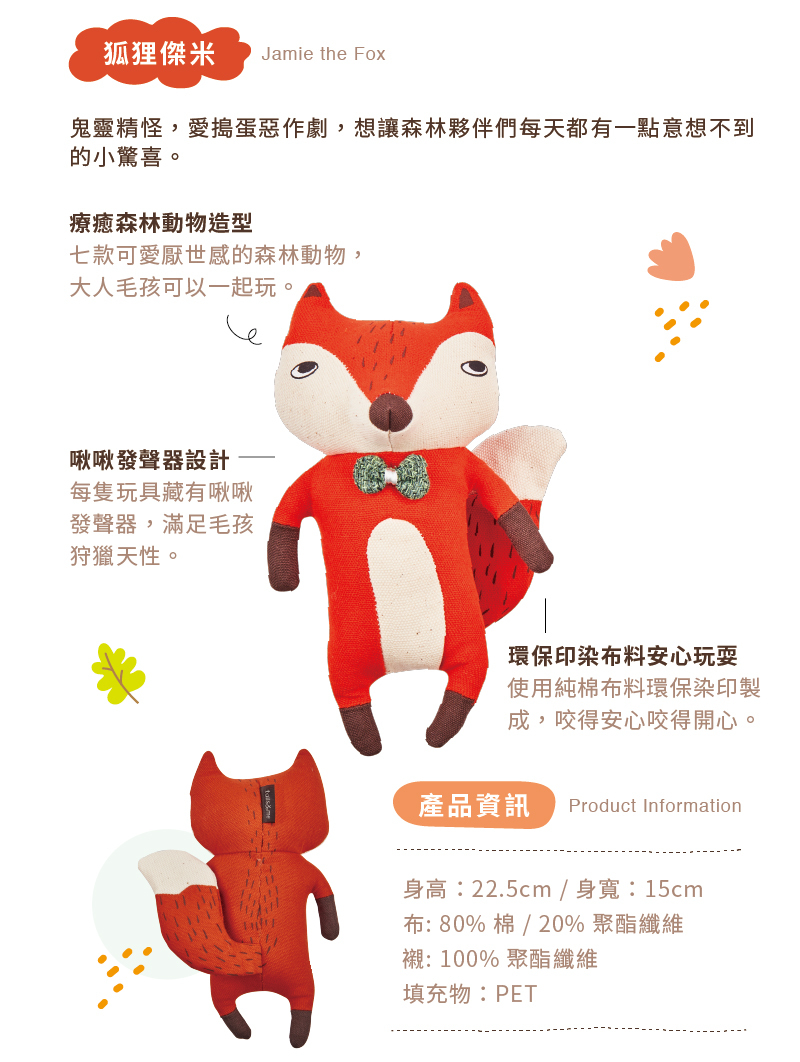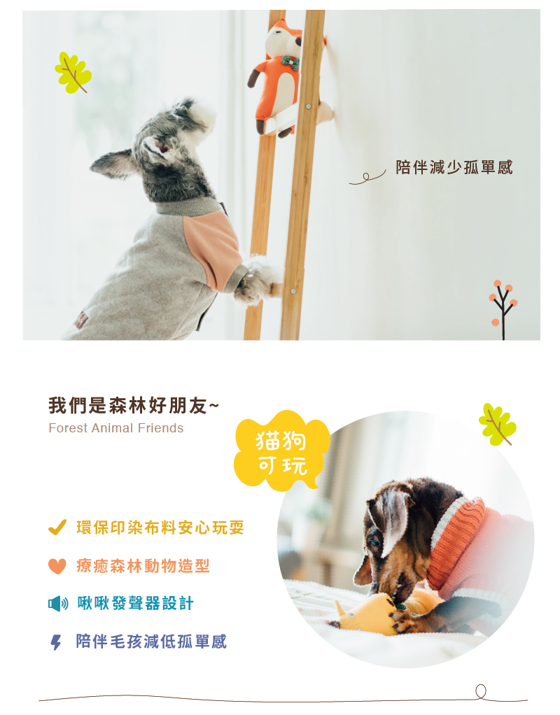 森林動物玩具以厚磅棉布製成、耐咬且安全無虞,並加入特殊材質響紙,帶給尾巴生活大大驚喜
