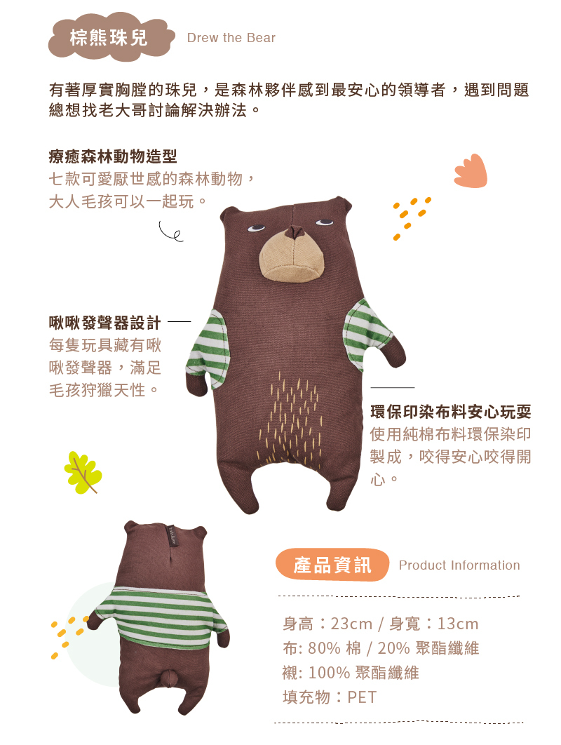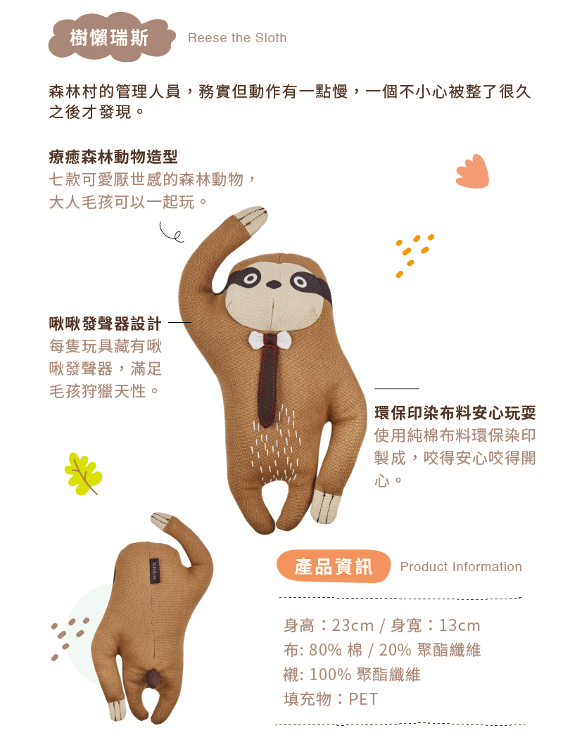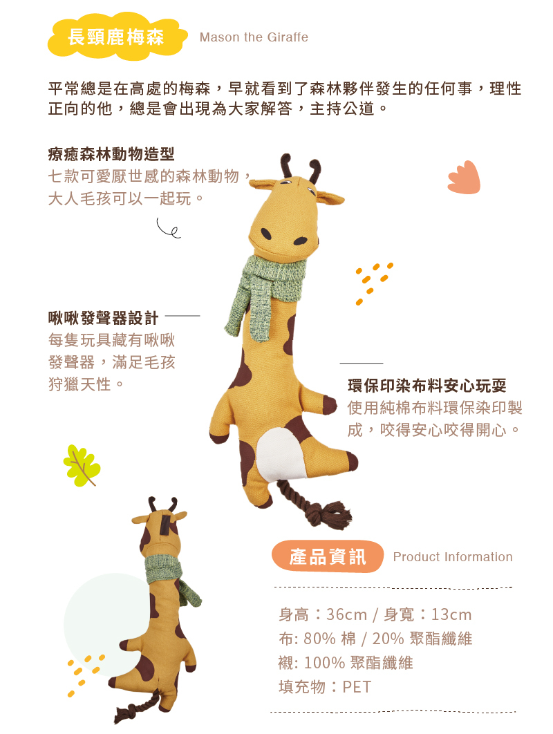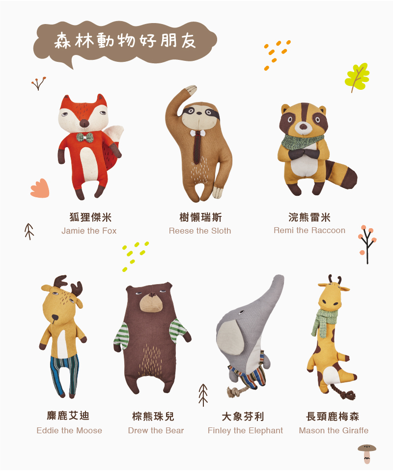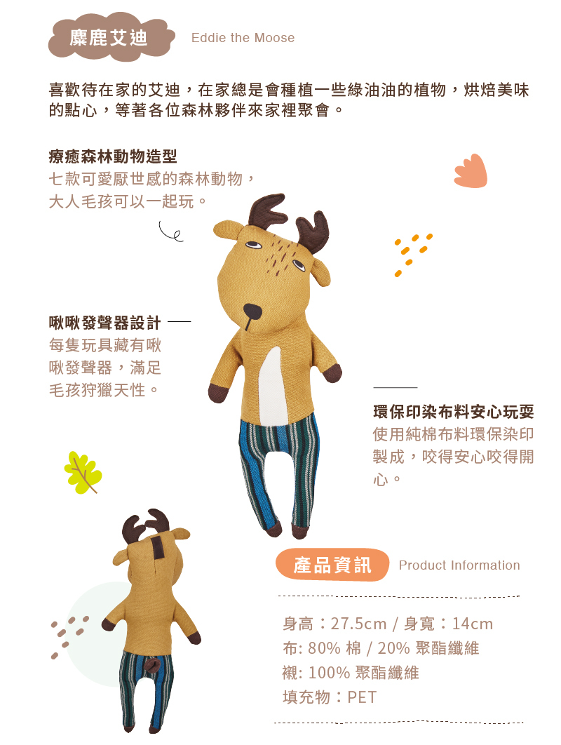 森林動物玩具以厚磅棉布製成、耐咬且安全無虞,並加入特殊材質響紙,帶給尾巴生活大大驚喜