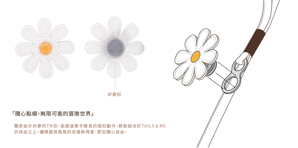 隨心點綴,無限可能的冒險世界-獨家設計的專利TM扣,能透過單手簡易的插扣動作,輕鬆結合於TAILS & ME的商品之上,讓情感與風格的表達無時差,更加隨心自由。