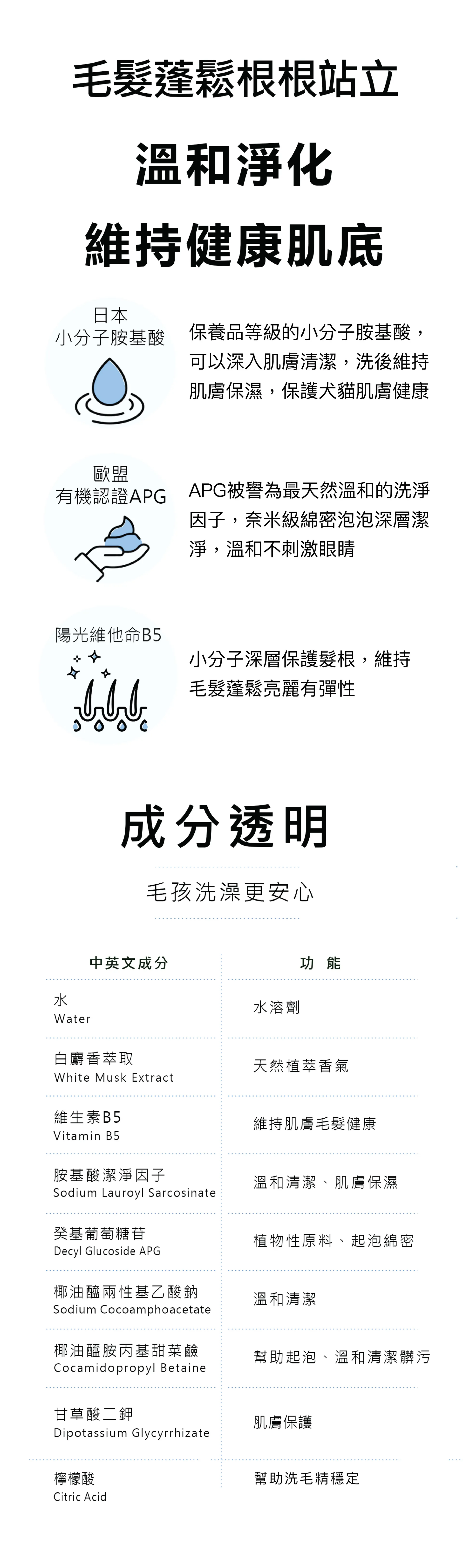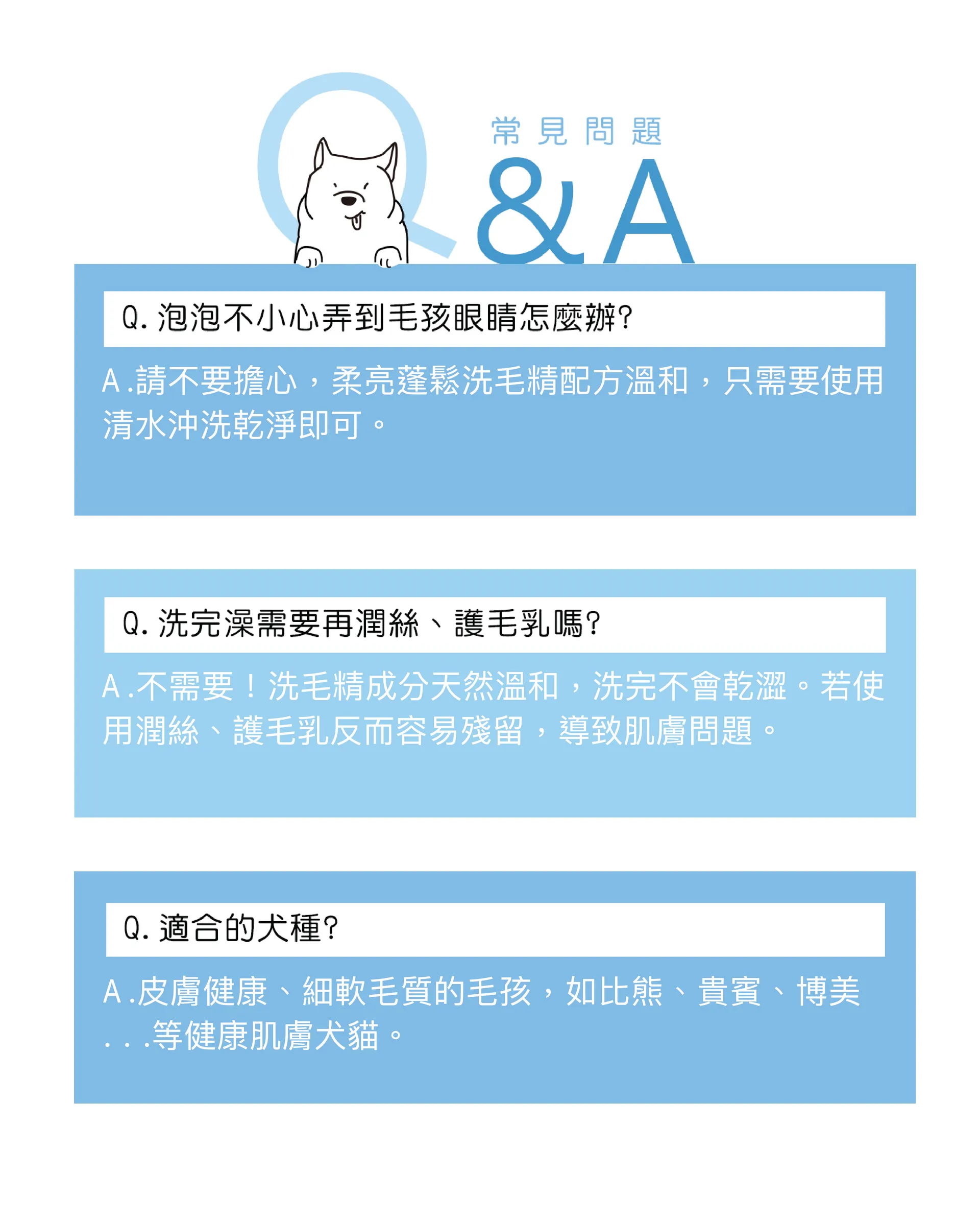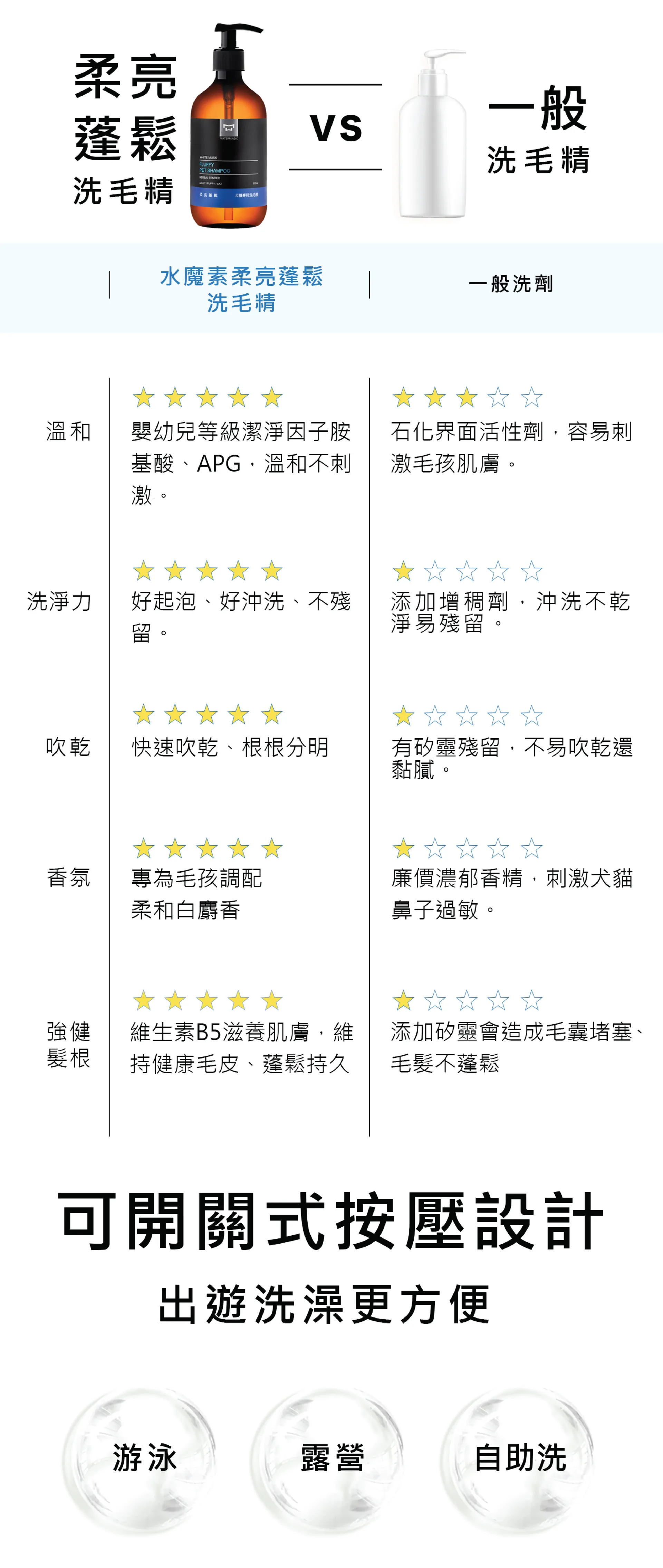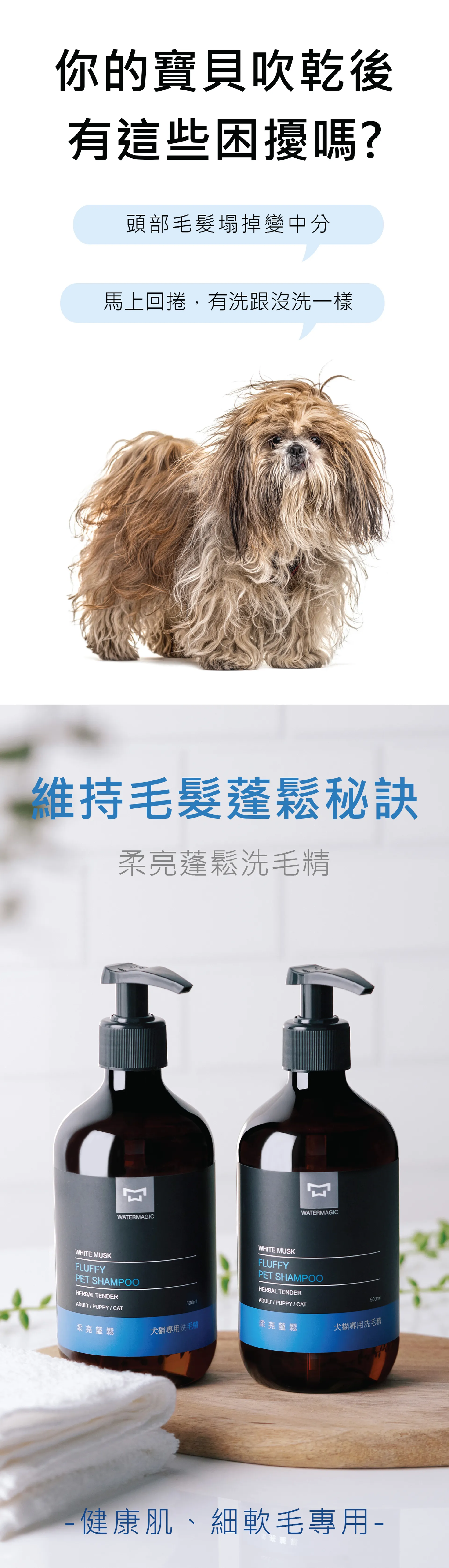 『柔亮蓬鬆洗毛精』是水魔素專為細軟毛及健康肌膚推出的,草本養護溫和配方狗狗貓咪專用沐浴乳。